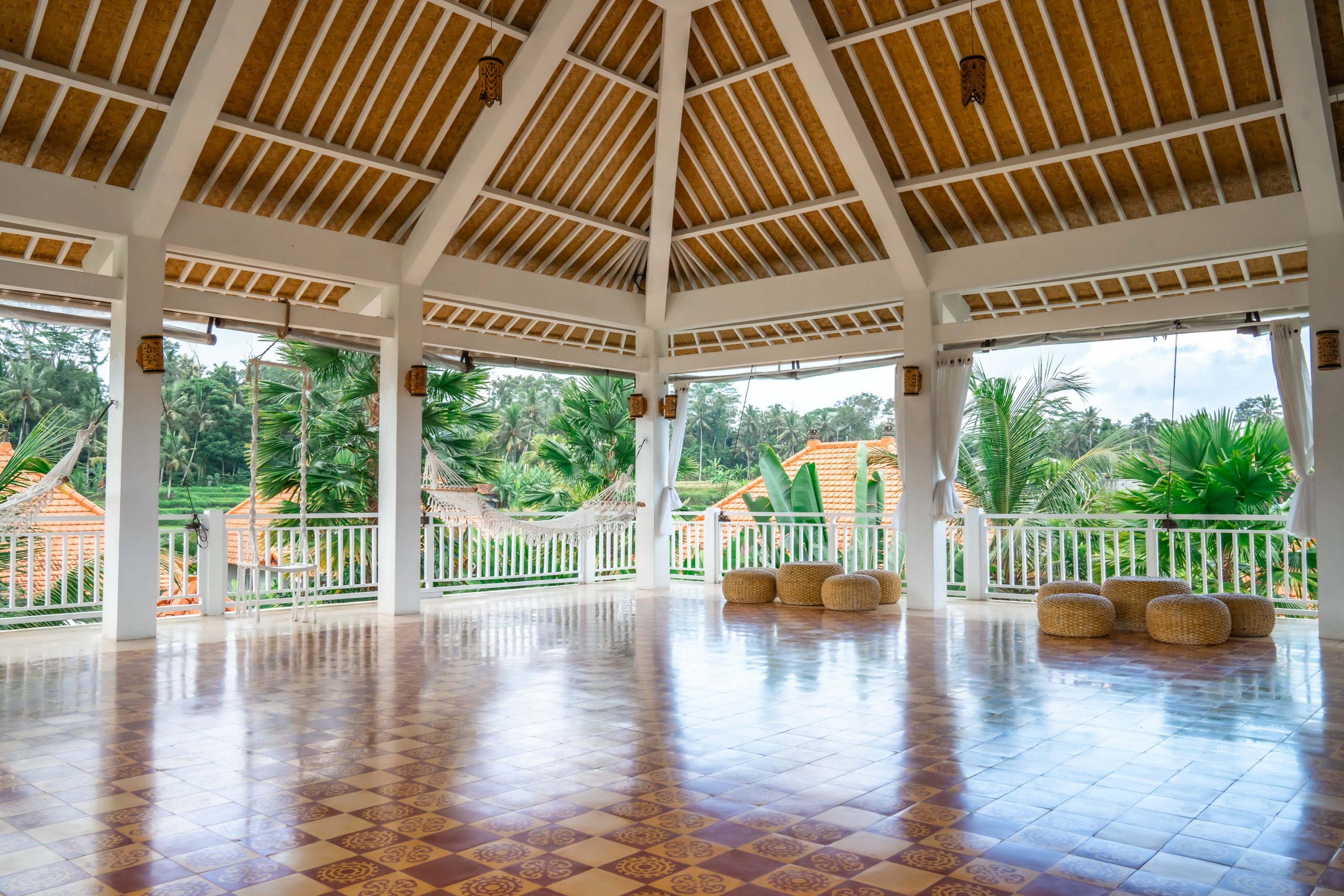 Spacious upstairs communal activity area overlooking rice paddies